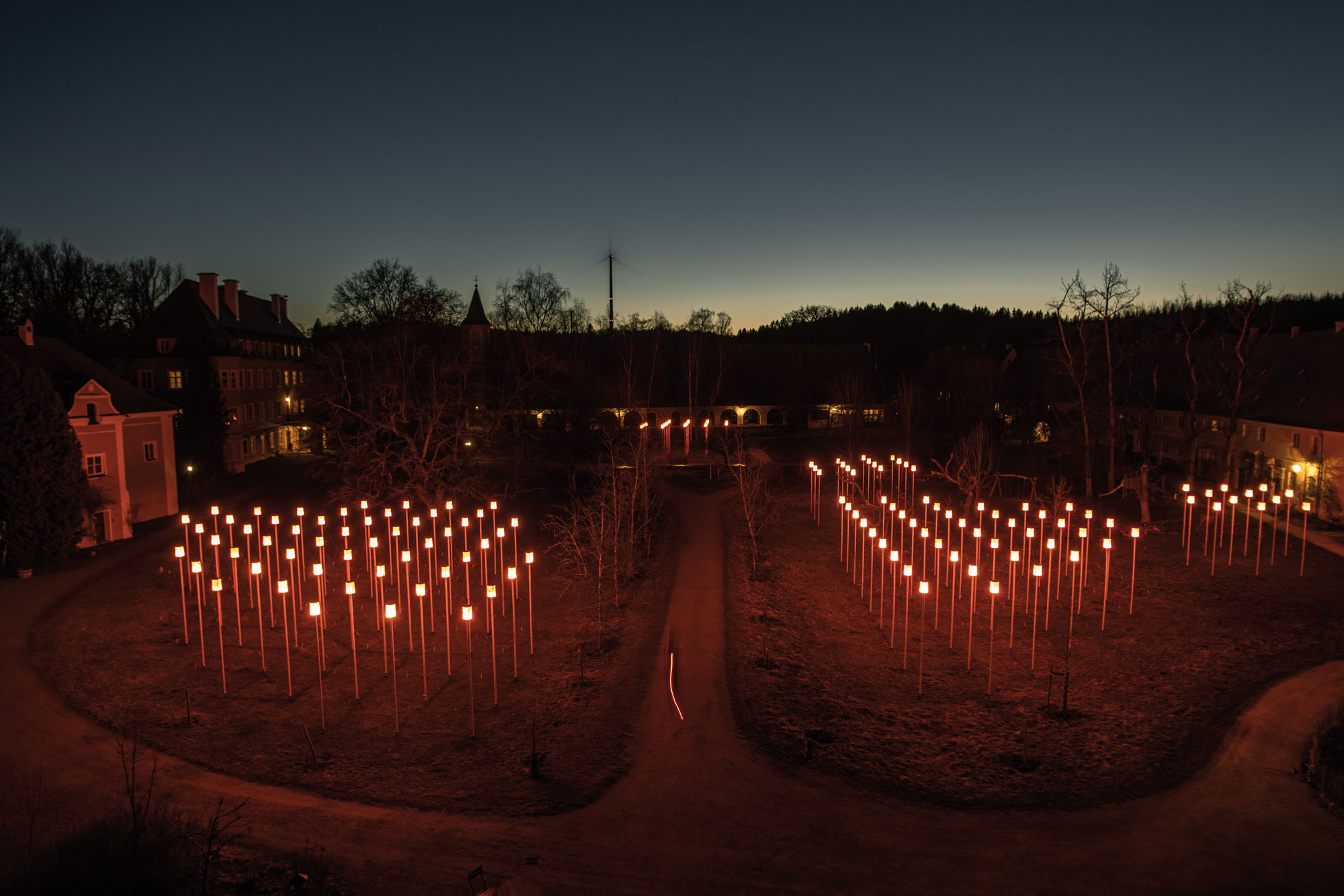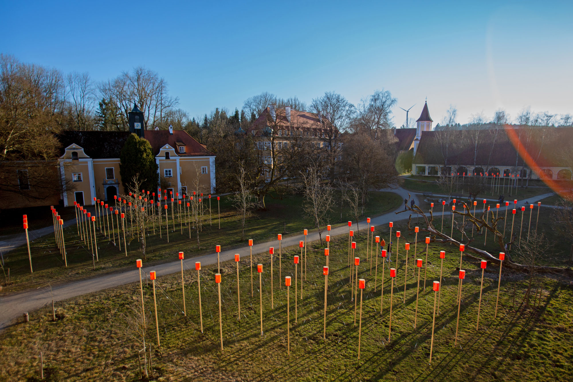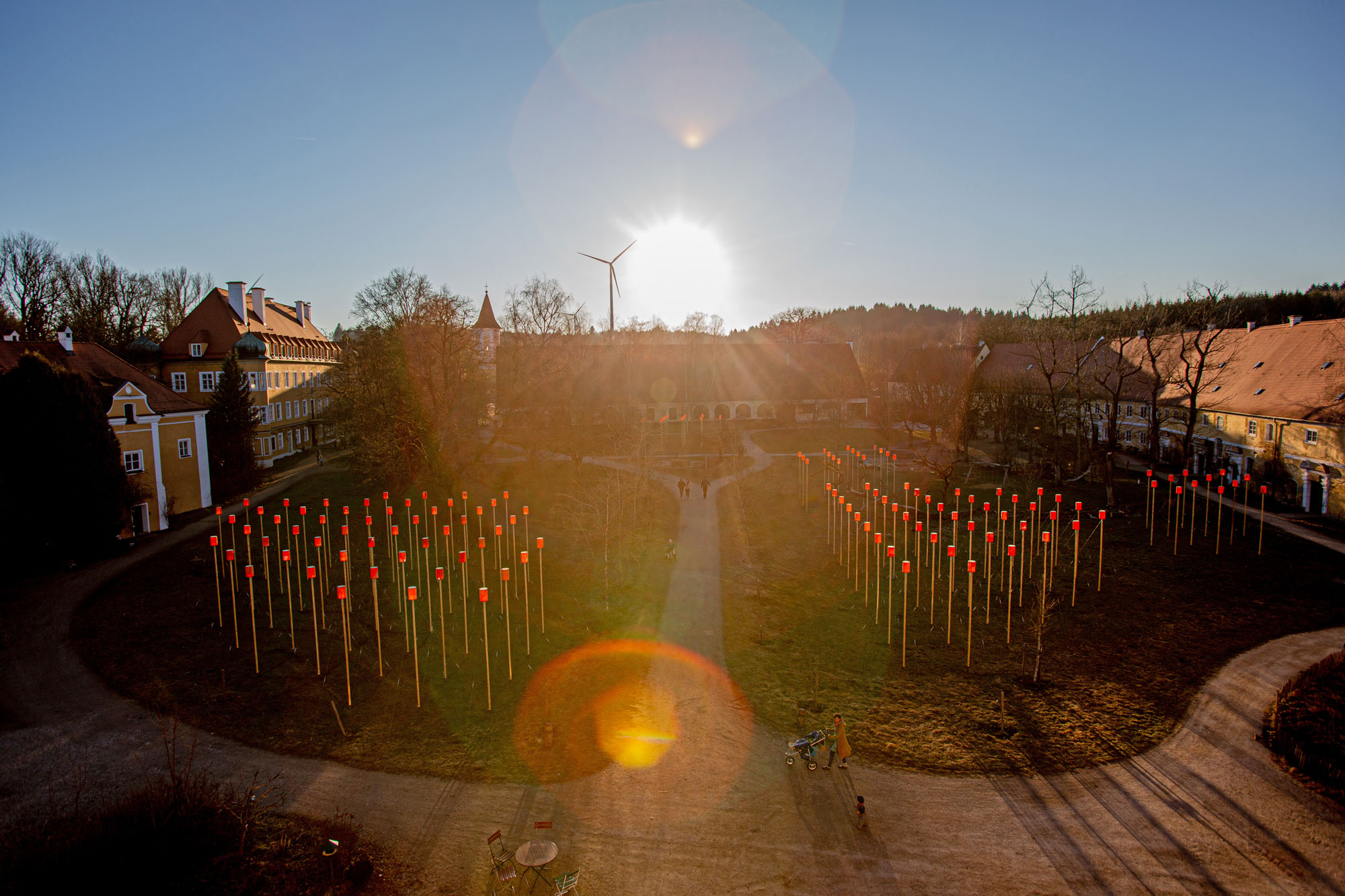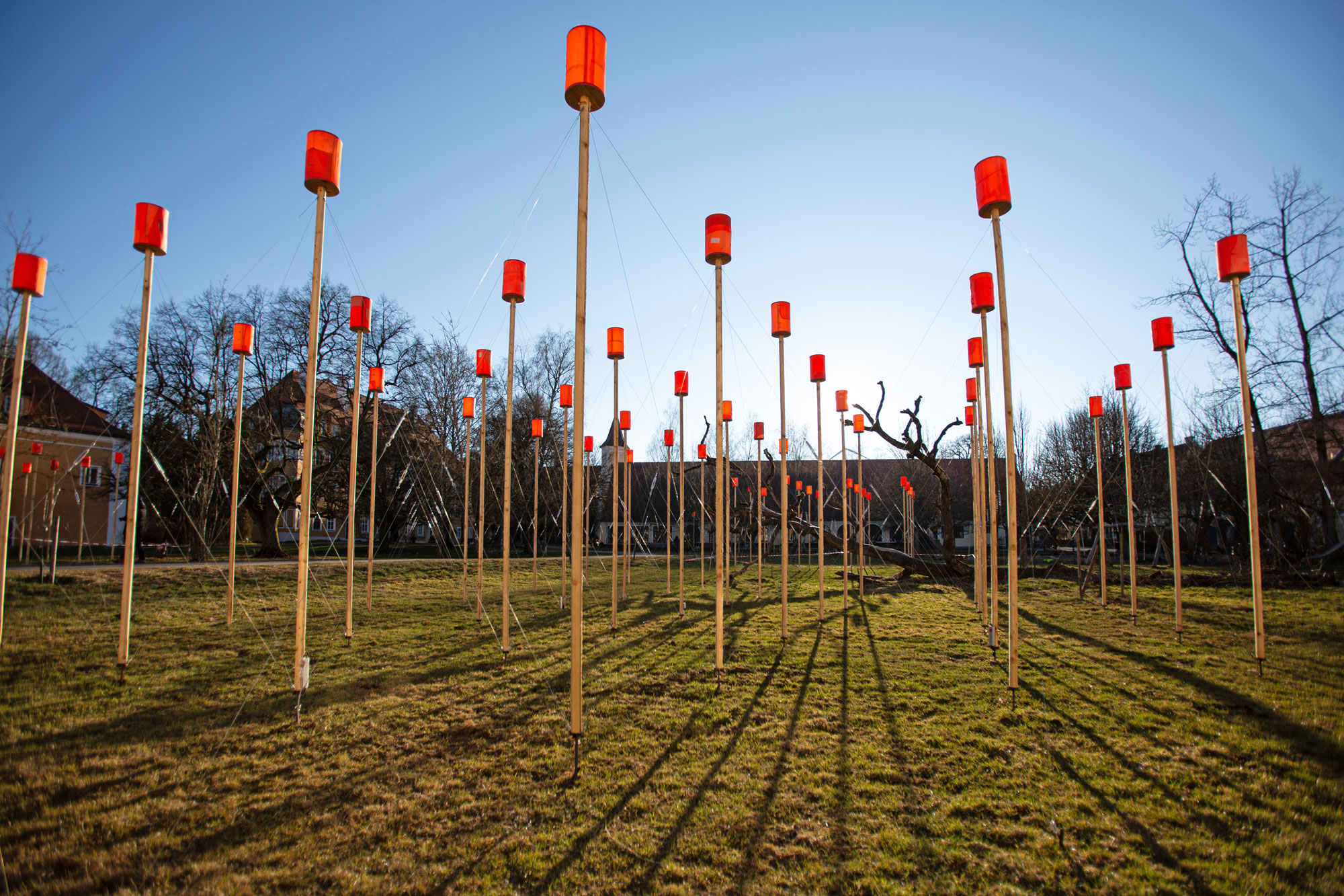 Bereits 2011 hat sich Markus Heinsdorff mit seiner Kunst-Landschafts-Installation aus 144 Stelen und 123 Schwimmwesten mit dem Thema der Flüchtlingskrise auseinandergesetzt. Aus gebrauchten Schwimmwesten, die von geretteten Menschen aus dem Mittelmeer stammen, entstanden 144 Leuchten, die in der Dämmerung glühten. So entstand im Innenhof des denkmalgeschützten Schlossanwesens Blumenthal bei Aichach ein magisches Leuchtenfeld – stellvertretend für Millionen Menschen auf der Flucht.