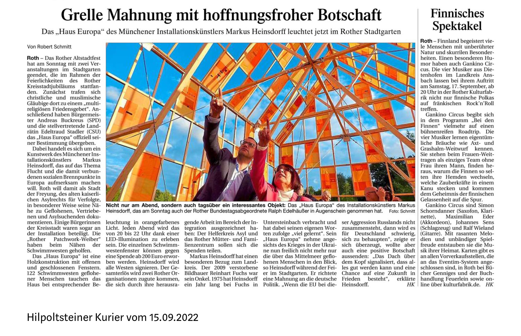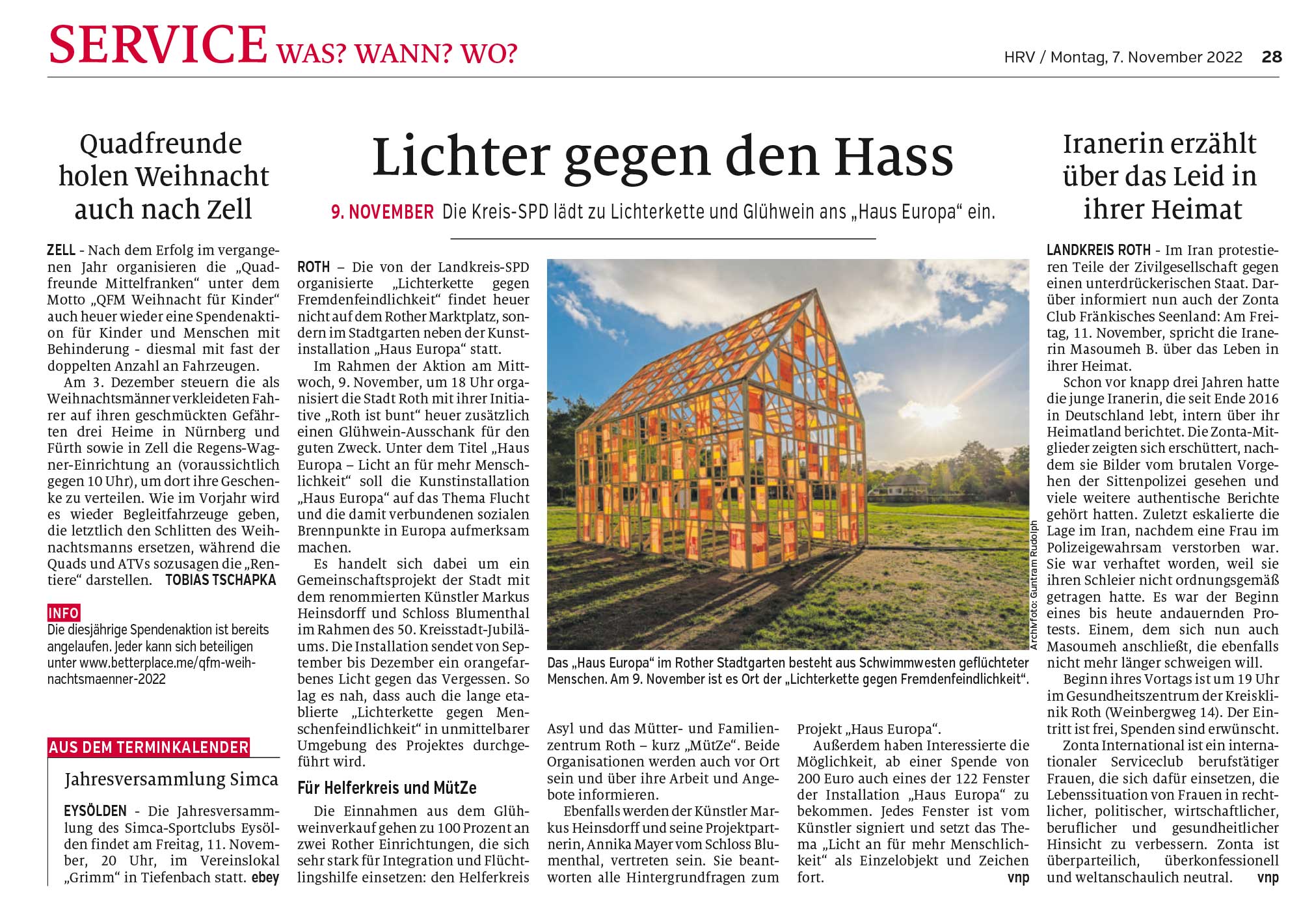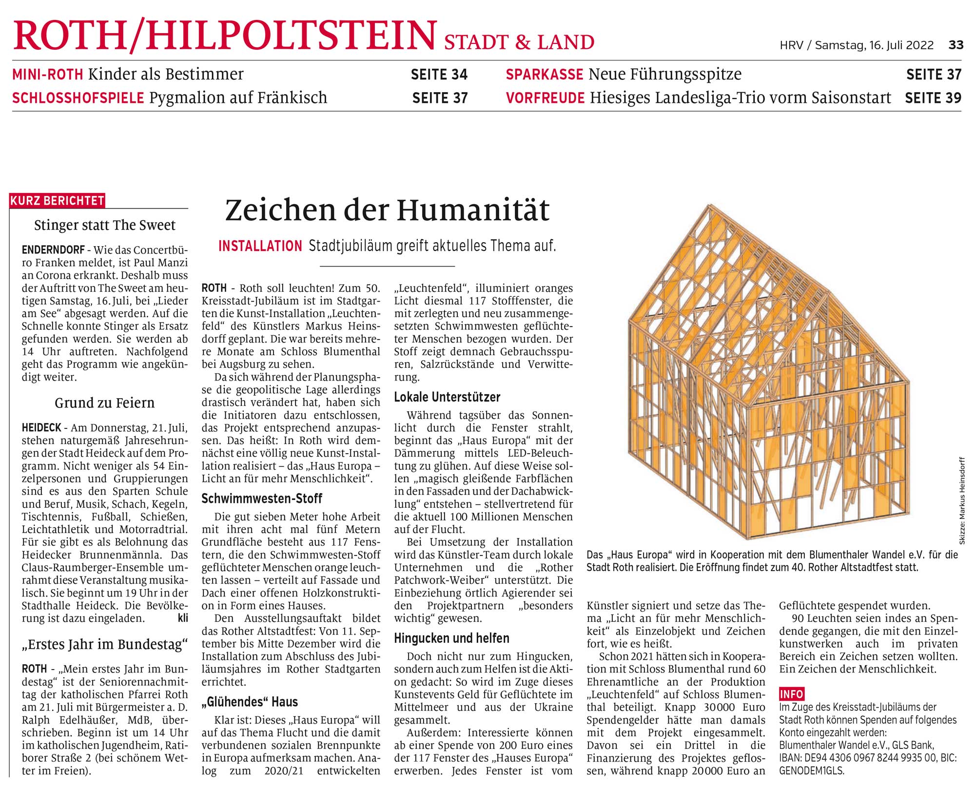 Im Rahmen des Kreisstadt-Jubiläums 2022 der Stadt Roth werden Spenden für Geflüchtete im Mittelmeer und aktuell auch für Menschen aus der Ukraine gesammelt. Interessierte können ab einer Spende von 200 Euro eines der 122 Fenster der Installation »Haus Europa« erhalten. Jedes Fenster ist vom Künstler signiert und setzt das Thema »Licht an für mehr Menschlichkeit« als Einzelobjekt im Privaten oder Öffentlichen fort.